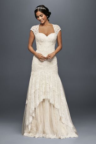 A sublimely romantic mermaid wedding dress, this feminine style features lace cap sleeves and an intricate bodice created from over 3,000 beads. The tiered skirt is a dreamy mix of lace and tulle.