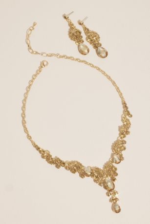 Gold flourishes are studded with topaz crystals on this statement set, featuring an elegant necklace and matching chandelier earrings. The perfect complement to your quince look.
