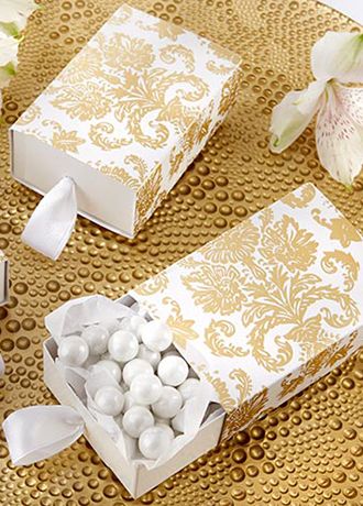 - Elegant drawer-style favor box of white cardstock and matte-gold foil in a traditional damask pattern with a white-satin ribbon pull.