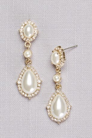 Three luminous pearls, surrounded by pave halos, are stacked on these dazzling drop earrings.