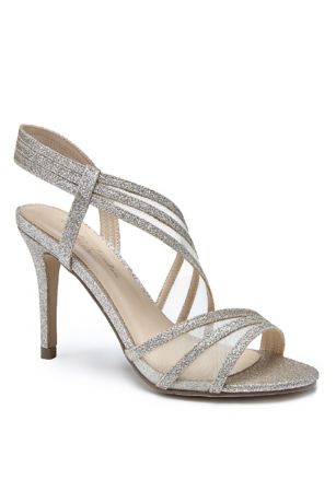 Swooping glitter straps and sheer mesh insets add a little edge to this pair of heeled sandals.