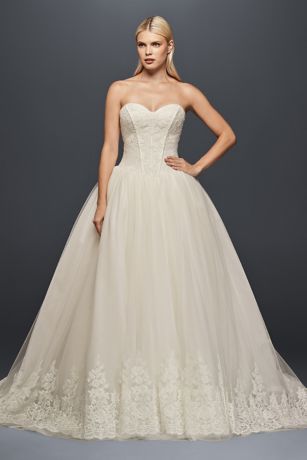 The combination of a structured, figure-flattering corset and a tulle skirt edged in ornate lace appliques creates a wedding dress that is both glamorous and romantic.