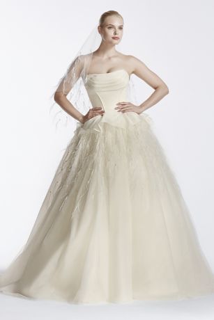 - Full, organza ball gown skirt is glamorously decorated with soft feathers for a luxurious, ultra-feminine bridal look.