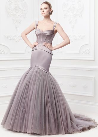 - Form fitting fit and flare gown features dramatic pleated tulle skirt.