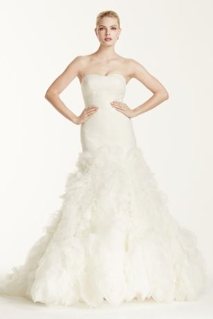 - Strapless lace mermaid gown with geometric shirred tulle bodice and sweetheart neckline.