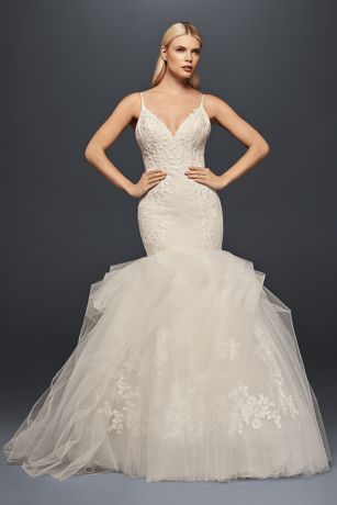Though the plunging neckline and structured, cartridge-pleated skirt (a classic Zac Posen detail!) are sleek and dramatic, this trumpet gown has a romantic side. A beautiful lace bodice and hand-sewn lace appliques on under-layers of the tulle skirt provide soft femininity.