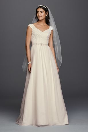 This A-line wedding dress with a V-neckline and cap sleeves evokes Grace Kelly refinement. The attached beaded sash supplies elegant sparkle, and the skirt's sheer tulle overlay infuses an ethereal element.