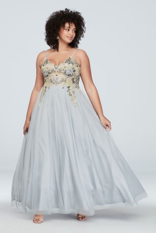 Dramatic, daring, and elegant, this ornate spaghetti-strap ball gown will catch every eye in the room with alluring details such as iridescent gems and floral embroidery.