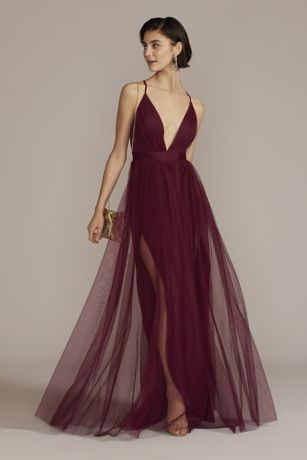Classic, with a sexy twist. This tulle prom dress features a plunging V-neckline and open back with crisscross spaghetti straps.