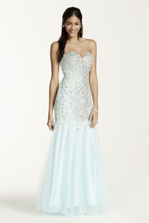 - Strapless bodice with sweetheart neckline is adorned in shimmering beads.