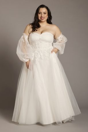 With statement sleeves or without? This tulle sweetheart ball gown wedding dress comes with removable billow sleeve for a versatile bridal look.