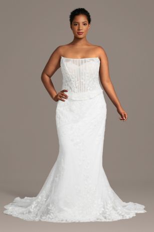 Romantic and refined, this two-piece mermaid wedding dress features intricately beaded Chantilly lace and a flattering basque waist that elongates the silhouette. The lace-up back gives you an adjustable fit and a dash of drama.
