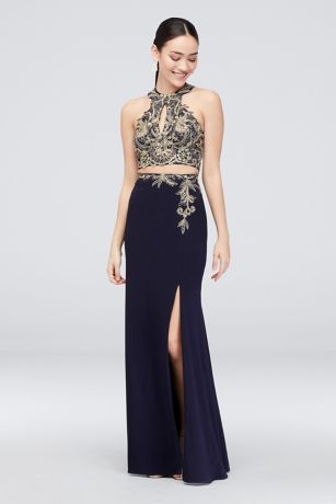 Ornate metallic lace and intricate details give a luxurious feel to this embroidered crop top and stretch-jersey skirt set.