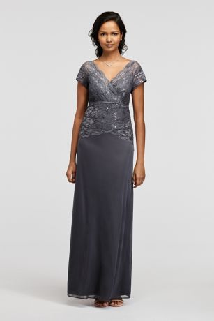 - Glitter lace with sequin mock cap sleeve wrap bodice features ultra-feminine scalloped edge v-neckline.