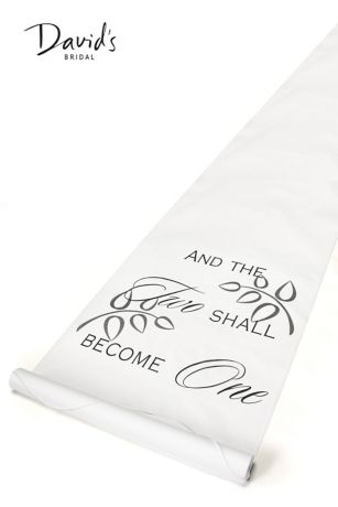 Begin your walk down the aisle with the phrasing of this remarkable aisle runner. Made of white, durable fabric, the aisle runner features wording "And The Two Shall Become One" printed in black and a leaf design printed in grey. Design is printed 8' from the beginning of the runner. Wording faces the aisle entrance. Adhesive strip at the top of the runner secures it to the flooring.