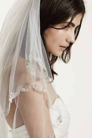 - Two tier finger-tip veil with floral lace edge is adorned with dazzling crystals.