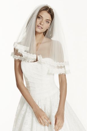 - Accented with intricate waves of gorgeous lace, this two tier short length veil is truly a timeless piece.