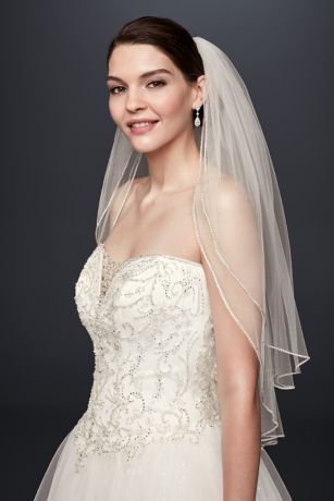Beautifully lined with sparkling rhinestone trim, this two-tier, mid-length veil is a classic addition to your bridal look.