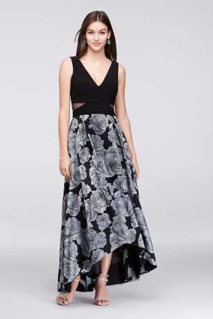Blue roses bloom on the full jacquard skirt of this jersey-bodice ball gown. Mesh cutouts at the sides add a modern touch.