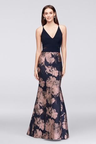 Roses bloom on the flared brocade skirt of this stretch-jersey-bodice mermaid gown. A plunging V-neck and mesh cutouts at the sides add sleek touches.
