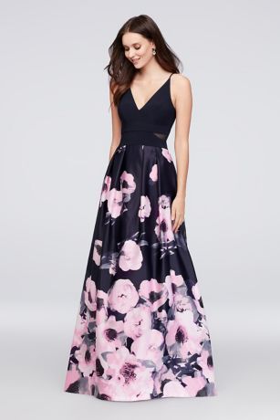 Pretty poppies bloom on the flowing satin skirt of this stretch-jersey-bodice ball gown. A plunging V-neck, mesh cutouts at the sides, and side pockets are extra-special touches.