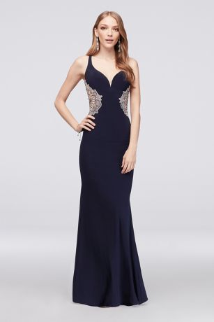 With a plunging V-neckline and hourglass-enhancing lace side insets, this jersey gown has an alluring surprise: a beaded mesh, lingerie-inspired back.
