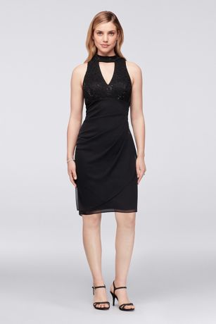 Curve-hugging and figure flattering, this side-swept mesh and lace cocktail dress features a high lace collar and a plunging V-neckline.