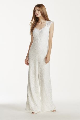 - Allover lace jumpsuit with cap sleeves, lace trimmed v-neckline and flattering wide legs