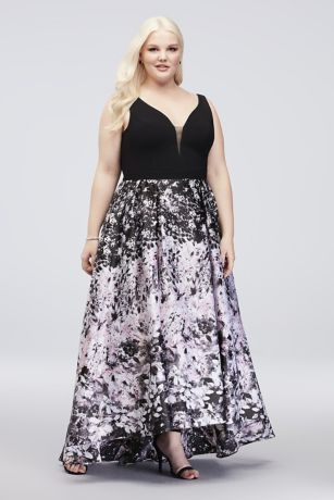 V-Neck Plus Size Ball Gown with Floral Print Skirt