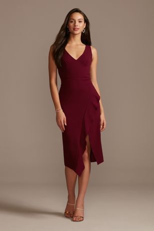 Comfort meets chic on this stretch crepe sheath dress, elevated with a body-hugging silhouette, a deep V-neckline, and a cascading ruffle slit. Finished with a fashion-forward midi hemline.