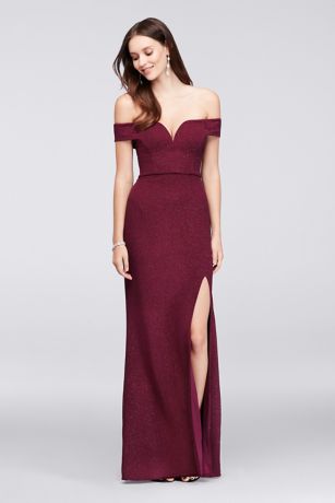 A V-wire sculpts a dramatic sweetheart neckline on the bodice of this glittery, stretch-knit sheath gown. Off-the-shoulder cuff sleeves keep the look totally on-trend.