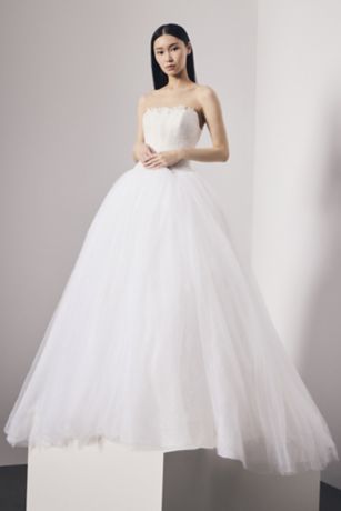 This ethereal Vera Wang Bride ball gown features an allover lace foundation veiled in soft layers of tulle, creating a luminous and romantic silhouette. The strapless bodice showcases an inverted basque waist and a peekaboo neckline, adding sculpted structure and couture detail.