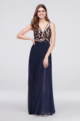 This easy-to-wear A-line gown features an eye-catching velvet and sequin bodice paired with a flowy mesh skirt.