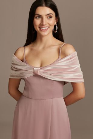 This off-the-shoulder stretch velvet wrap fastens at the center to look like a bow, adding coverage and charm to special occasion or bridesmaid looks.