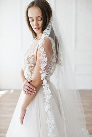 Walk down the aisle in style in this this airy veil, featuring Venice lace trim with scattered rhinestones.