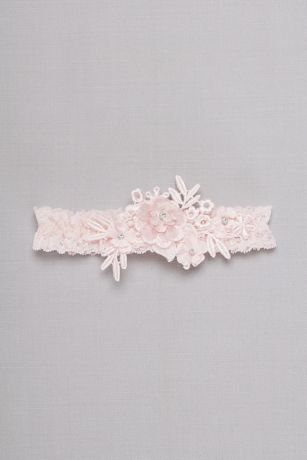 A touch of blush makes this dimensional floral Venise lace garter, finished with rhinestone accents, a dream come true.