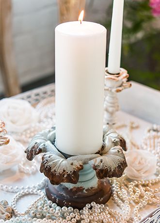 Featuring all the character of a well-loved accessory made more appealing with the passing of time, this pillar candle holder will look equally as lovely at your ceremony, reception, and even in your home. Whether displaying your Unity Candle or used to enhance your tabletop displays, this quality piece is the picture of vintage chic.