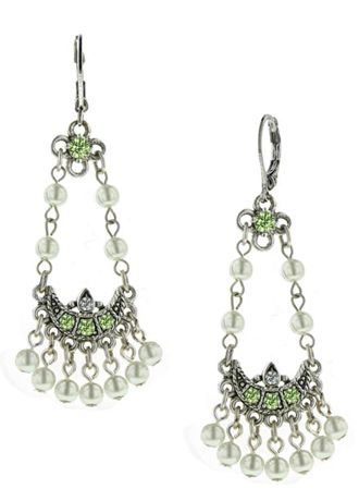 • Pearls dangle from the sideways crescents which are antiqued and set with crystals.