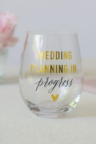 The perfect complement to a planning session, this stemless wine glass features the phrase "wedding planning in progress."