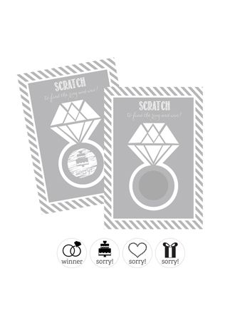 Invite guests to play this fun and unique bridal shower game! Our Scratch Off Game Cards are printed with a diamond ring and the phrase SCRATCH to find the ring and win!. Cards have a silver circle with hidden wedding related icons that say sorry! Only one winning card will reveal the rings and that is the winner! Guests must SCRATCH off the silver coating to reveal their hidden surprise.