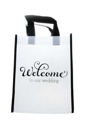 Wedding Welcome Bags are a thoughtful way to make your out of town guests feel more comfortable. They have made a special effort to attend your wedding so welcome them with these re-useable tote bags! Fill the bags with edible treats such as nuts & chocolate for those midnight munchies, local maps & magazines to help guide and entertain, and a few water bottles to make sure they stay hydrated. Welcome Bags are also a great way to share information about the weekend - just add an itinerary of the upcoming events you have planned for the weekend. Each bag is white with black accents and is pre-printed with \"Welcome to Our Wedding\".