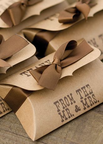 Sure to be a hit, these kraft pillow-shaped favor boxes will be a favorite with guests. The box flap is shaped with scalloped edge and printed in antique western type with the wording "Thank you from the Mr. & Mrs." in brown. It is recommended to use wrapped candies or liners when placing food into any type of favor box or container.