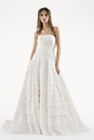 - Strapless A-line drop waist organza and tulle gown features all over sequined banded bias-cut-organza.