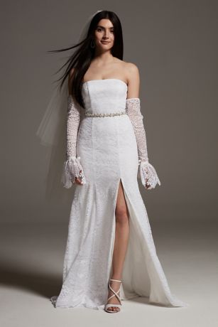 An elegant strapless dress with sexy statement details, this White by Vera Wang lace wedding dress is the perfect option for the bride ready to get the party started. The sheath, crafted from leafy fern lace, features a thigh-high skirt slit and buttons down the back. Removable illusion lace long sleeves complete the look.