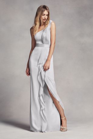 A limited edition archival style, this White by Vera Wang one-shoulder chiffon dress flows elegantly, with soft ruffles and a satin belt that cinches the waist. A graceful choice for bridesmaids or any formal celebration.
