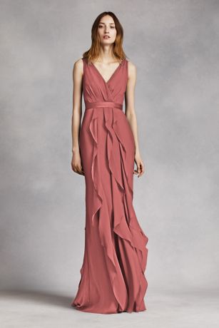 A limited edition archival style, this chiffon V-neck dress from White by Vera Wang features a flattering surplice bodice and a sleek satin belt. The long skirt flows beautifully with bias-cut ruffles, adding soft movement and romance for weddings, parties, and special occasions.