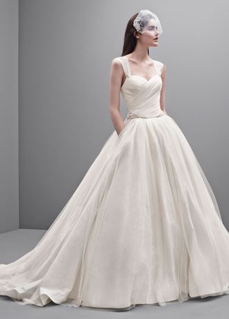 Lavish White by Vera Wang taffeta ball gown with embellished straps and draped tulle detail.