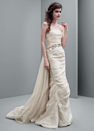 - Strapless taffeta column gown with contrasting draped tulle overlay and jeweled vine belt.