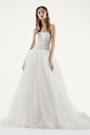 - Strapless ball gown with full tulle skirt and tulle veiling over jeweled lattice bodice.