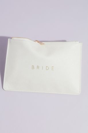 Keep your essentials close in this white vegan leather pouch with "Bride" in gold. Open it up to reveal a hidden "I said yes!" detail inside.